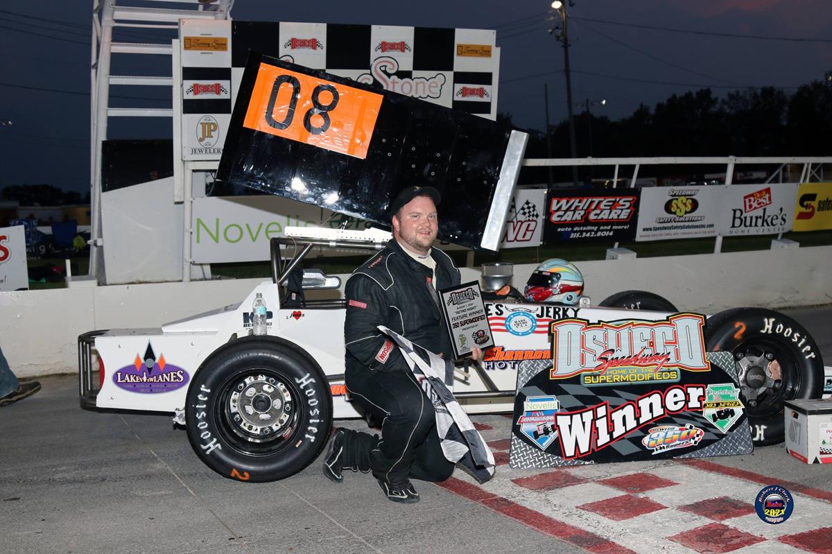 OSWEGO, NY (August 8, 2021) - Speedway veteran Dalton Doyle picked up his third career 350 Supermodified win and first with his new Hawk Chassis 350 in Saturday night’s 25-lap main event on Retro Night at Oswego Speedway.