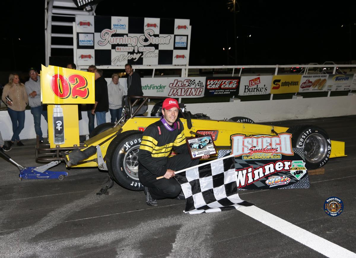 OSWEGO, NY (May 29, 2022) - Piloting the iconic No. 02, third generation driver Brandon Bellinger held off late challenges from Dan Connors Jr. to earn his fourth career victory at Oswego Speedway, and first in the 75-lap Jim Shampine Memorial last Saturday night.