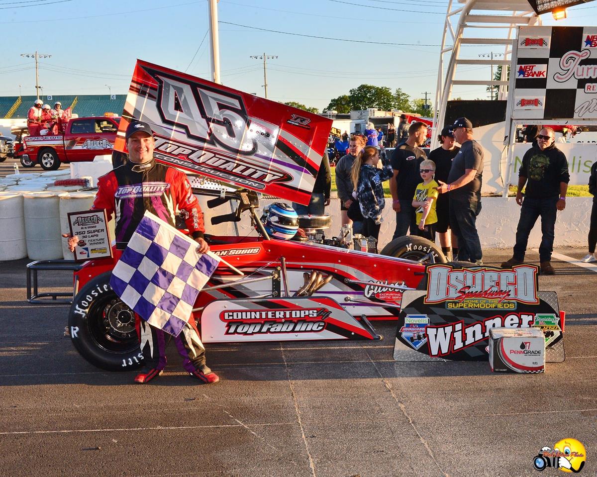 OSWEGO, NY (June 5, 2022) - Driving Mike Barbera’s Top Quality Motorsports No. 45 ‘Red Rocket,’ Oswego Speedway veteran Brian Sobus picked up his first career J&S Paving 350 Supermodified feature win this past Saturday night.