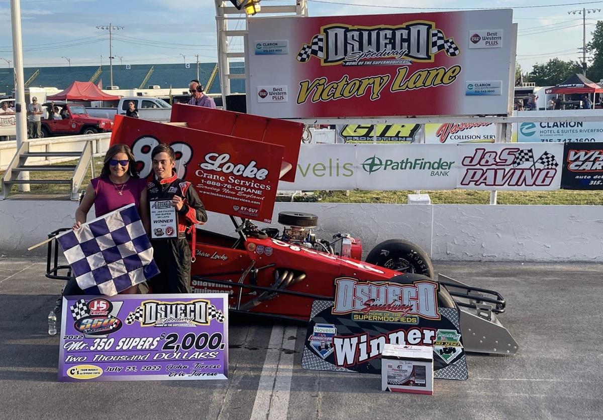 OSWEGO, NY (July 23, 2022) - 16 year-old Chase Locke expanded his J&S Paving 350 Super point lead with a dominating drive from sixth to his second career win worth $2,000 plus the rights of being called ‘Mr.’ 350 Supermodified for this season.