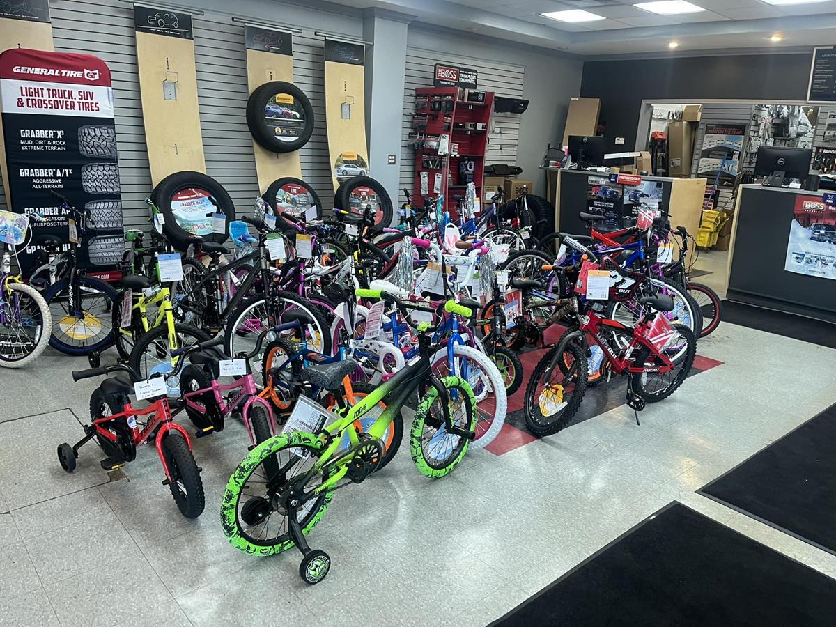 Several of these kids bikes are currently on display at A&P Automotive located at East 9th and Bridge Streets in Oswego, with more bikes arriving daily. Some bikes are also stored at another location.