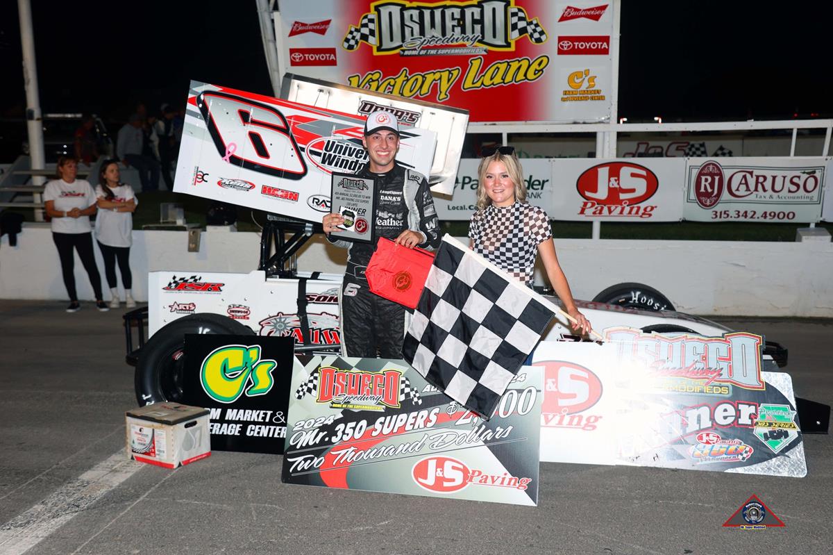 OSWEGO, NY (August 10, 2024) - In a commanding performance at Oswego Speedway last night, points leader Josh Sokolic claimed his third feature win of the season and the seventh of his career in the 30-lap $2,000-to-win Mr. J&S Paving 350 Supermodified feature. With this victory, Sokolic not only solidified his position at the top of the standings but also surpassed Jeffrey Battle to become the all-time wins leader in the 350 Supermodified division.